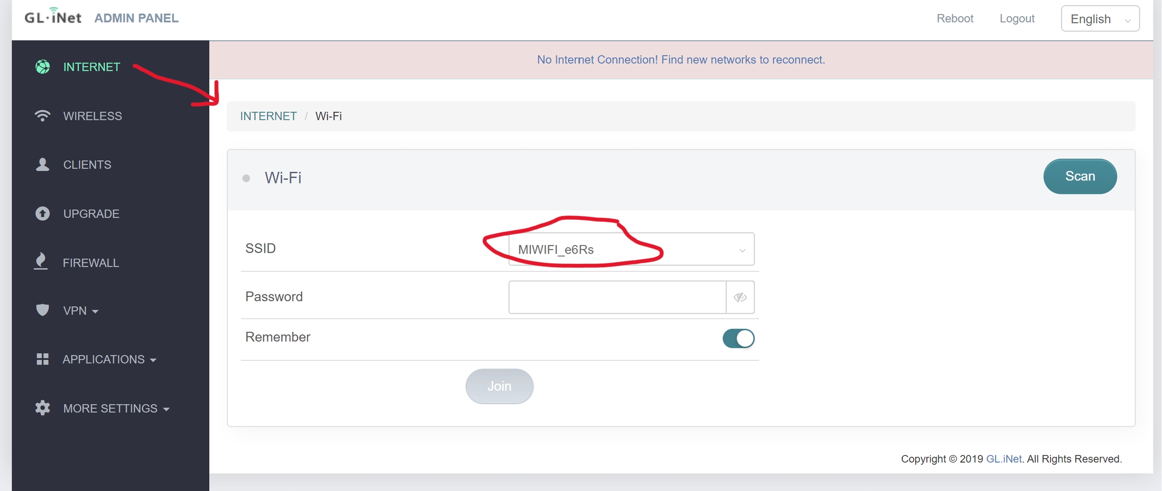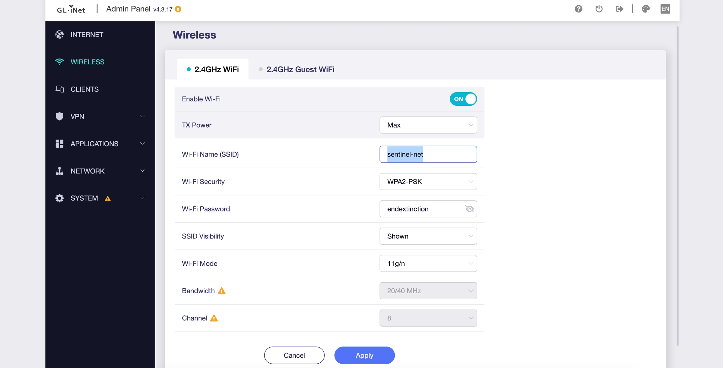 Abra el navegador y navegue a 192.168.8.1 (PW: endextinction). Esto debería aparecer al navegar a 192.168.8.1 en sentinel-net por primera vez.